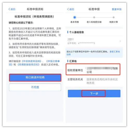 3月1日起,2023年度個(gè)稅綜合所得匯算開(kāi)始。納稅人如需在3月1日至20日之間辦理匯算,可在2月21至3月20日(每日6:00-22:00)通過(guò)個(gè)稅APP預(yù)約。3月21日至6月30日,納稅人無(wú)需預(yù)約,可以隨時(shí)辦理。 步驟二、核對(duì)基礎(chǔ)信息、選擇匯繳地 2023年收入額大于6萬(wàn)元的,系統(tǒng)會(huì)默認(rèn)“標(biāo)準(zhǔn)申報(bào)”;如果2023年的收入額未超過(guò)6萬(wàn)元且已預(yù)繳稅款,就會(huì)進(jìn)入“簡(jiǎn)易申報(bào)”流程,確認(rèn)數(shù)據(jù)無(wú)誤后,提交即可。
