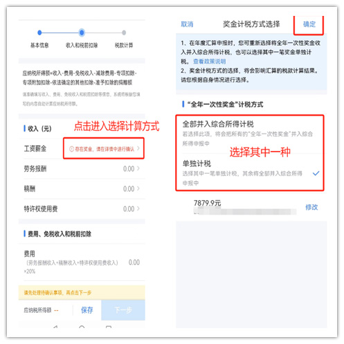 步驟三、核對(duì)收入和稅前扣除信息 (1)選擇年終獎(jiǎng)計(jì)算方式 年終獎(jiǎng)可以單獨(dú)計(jì)稅,也可以合并到綜合所得稅中計(jì)稅,哪種方式交稅少,選擇有利于自己的方式。