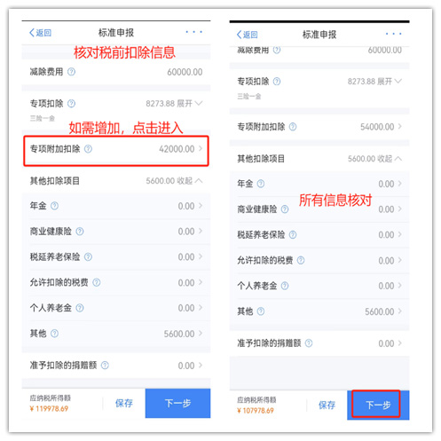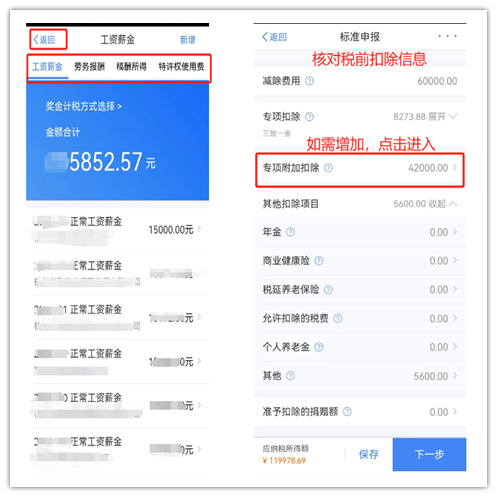 (2)核對(duì)收入、扣除信息 (1)核對(duì)、完善收入情況 在收入列表,您可分所得項(xiàng)目,進(jìn)行收入的【新增】和【修改】; 如果您的收入納稅明細(xì)信息和實(shí)際發(fā)放的收入不一致;或者沒(méi)有在A單位入職,卻有收入記錄。 這種情況莫慌,可以先找單位核實(shí);核實(shí)后確實(shí)沒(méi)有收到該筆收入的或者從未在改單位任職,可以通過(guò)【申訴】來(lái)解決~ (2)核對(duì)扣除信息 社保公積金、專(zhuān)項(xiàng)附加扣除、年金、捐贈(zèng)、個(gè)人養(yǎng)老金、捐贈(zèng)等扣除情況;如果沒(méi)有足額扣除,可以填寫(xiě)補(bǔ)扣信息。