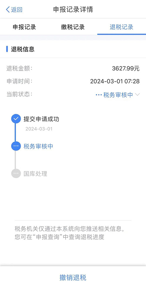 (2)申請(qǐng)退稅 若您存在多交稅款,可點(diǎn)擊【申請(qǐng)退稅】,稅務(wù)審核后會(huì)匯款給個(gè)人銀行卡。