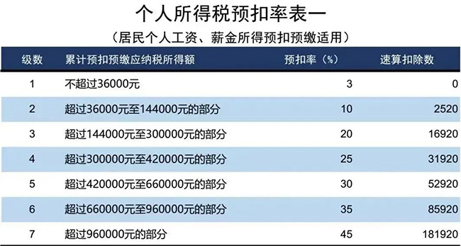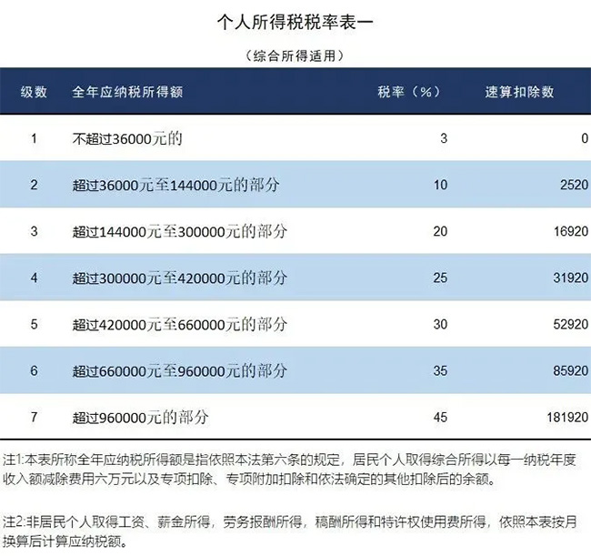 綜合所得是指居民個人取得的工資、薪金所得;勞務報酬所得;稿酬所得和特許權使用費所得,適用百分之三至百分之四十五的超額累進稅率(預扣率表見前述一、二)。