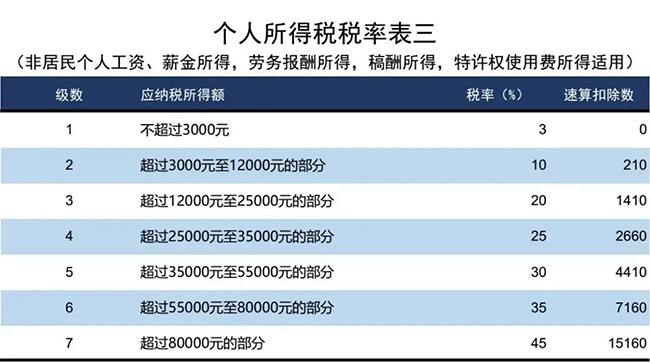4、非居民個人工資、薪金所得;勞務報酬所得;稿酬所得;特許權使用費所得稅率表