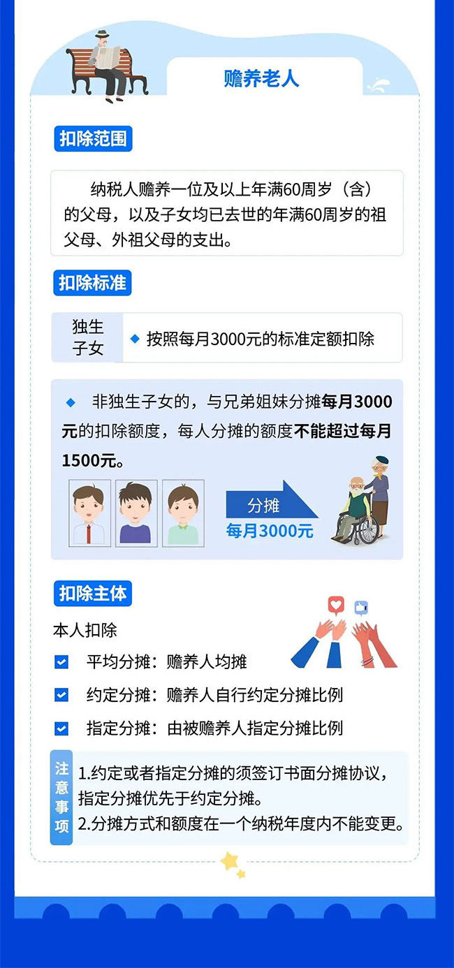 三、贍養老人專項附加扣除標準,由每月2000元提高到3000元。其中,獨生子女按照每月3000元的標準定額扣除;非獨生子女與兄弟姐妹分攤每月3000元的扣除額度,每人分攤的額度不能超過每月1500元。