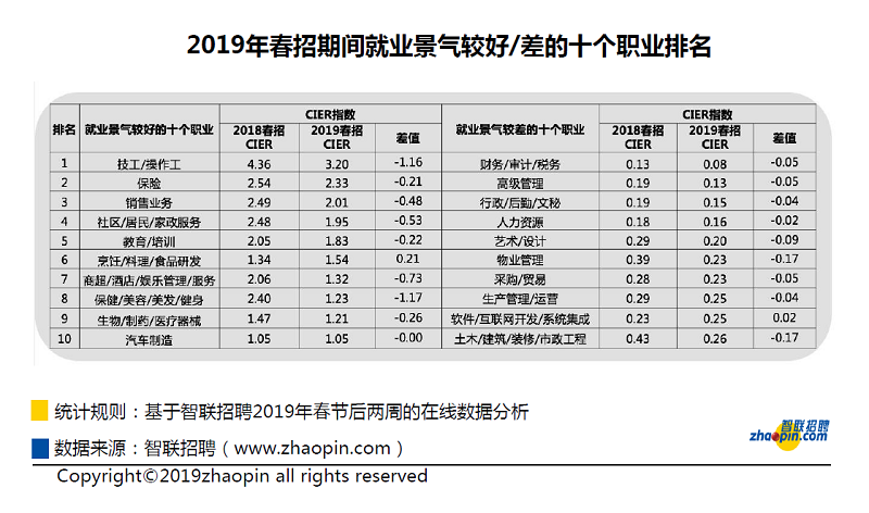 數據顯示,從2019年春季求職期間職業景氣度排名結果來看,就業形勢最好的職業是技工/操作工,CIER指數為3.20,其次是保險及銷售業務,CIER指數分別為2.33、2.01。技工/操作工、家政服務、美容美發等職位大多屬于工作強度大,且工作體驗比較辛苦,求職者對這類崗位的青睞度本身不高,因此用工需求較求職人數高出許多。