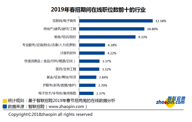 智聯招聘數據顯示,從春季需求量*大的十大行業來看,互聯網/電子商務、房地產/建筑/建材/工程、教育/培訓/院校行業成為前三甲。這個排名和2018年的保持一致,盡管互聯網行業經過了2018年招聘需求全線下降的經歷,仍然是穩坐吸納就業的寶座的“頭號玩家”。值得注意的是,電子技術/半導體/集成電路進入了需求前十的行業,這和國家去年開始大力支持中國發展自己的芯片有關,政策的傾斜會讓電子技術/半導體/集成電路行業的市場更加廣闊,因此企業的用人需求也隨之大增。既然有新的行業上榜,也就代表有其他的行業熱度在下降,貿易/進出口行業在2018年在企業發布的在線職位數中排名第八,今年的排名下滑到第11名,或受到中美貿易摩擦對發展信心的影響所致。