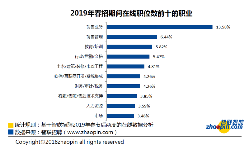 智聯招聘數據顯示,從春季需求量*大的十大職位來看,銷售業務、銷售管理、教育/培訓排名前三,而2018年前三大職位是銷售業務、行政/后勤/文秘、軟件/互聯網開發/系統集成。其中銷售相關崗位位居需求榜首,不難理解,在企業追求發展盈利的過程中,急需銷售角色的員工開拓市場,貢獻利潤。在春招期間需求次之的是行政、財務、人力資源等職能型崗位,這類崗位是公司經營管理的基礎,不可或缺,用人需求長期存在。
