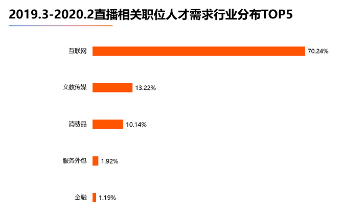 2019年3月-2020年2月,在直播類職位人才需求占比最高的前5個城市中,北京以26.52%的占比位居榜首?!扒晟潭肌睆V州與素有電商大本營之稱的杭州并列第二,人才需求占比均為15.91%。上海以14.75%的占比緊隨其后。深圳則以7.96%的占比擠入前五。 北京作為創新創業的集聚地,是國內眾多知名直播、短視頻類公司的所在地。如抖音、快手、映客、花椒直播等都將公司總部設在北京,因此北京對直播類人才需求最旺盛。而杭州作為我國電商行業的大本營,以及有阿里的坐鎮,對直播帶貨類人才的需求一直以來都較為旺盛,超過半數淘寶機構都在杭州,淘寶直播的產業鏈上下流催生了大量相關崗位需求。“千年商都”廣州自2019年起開始化身“直播之城”,當地的服裝、旅游、美食等越來越多行業從業者在直播間里找到源源不斷的消費者。 2、行業人才需求分布:互聯網占據主導地位,直播類職位人才需求占比超70%