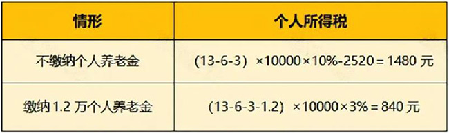 因此,對于不影響稅率的情況下,可以節(jié)省的個(gè)人所得稅額=當(dāng)年實(shí)際繳納的個(gè)人養(yǎng)老金×個(gè)人綜合所得對應(yīng)稅率。