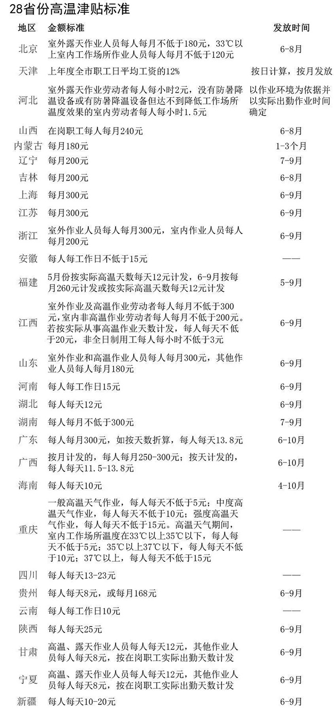 高溫津貼標準由省級人力資源社會保障行政部門會同有關部門制定,并根據社會經濟發展狀況適時調整。各地發放高溫津貼的時間并不一致,但不少地方是從6月或7月份開始發這筆錢。以下為28省份高溫津貼標準一覽表。