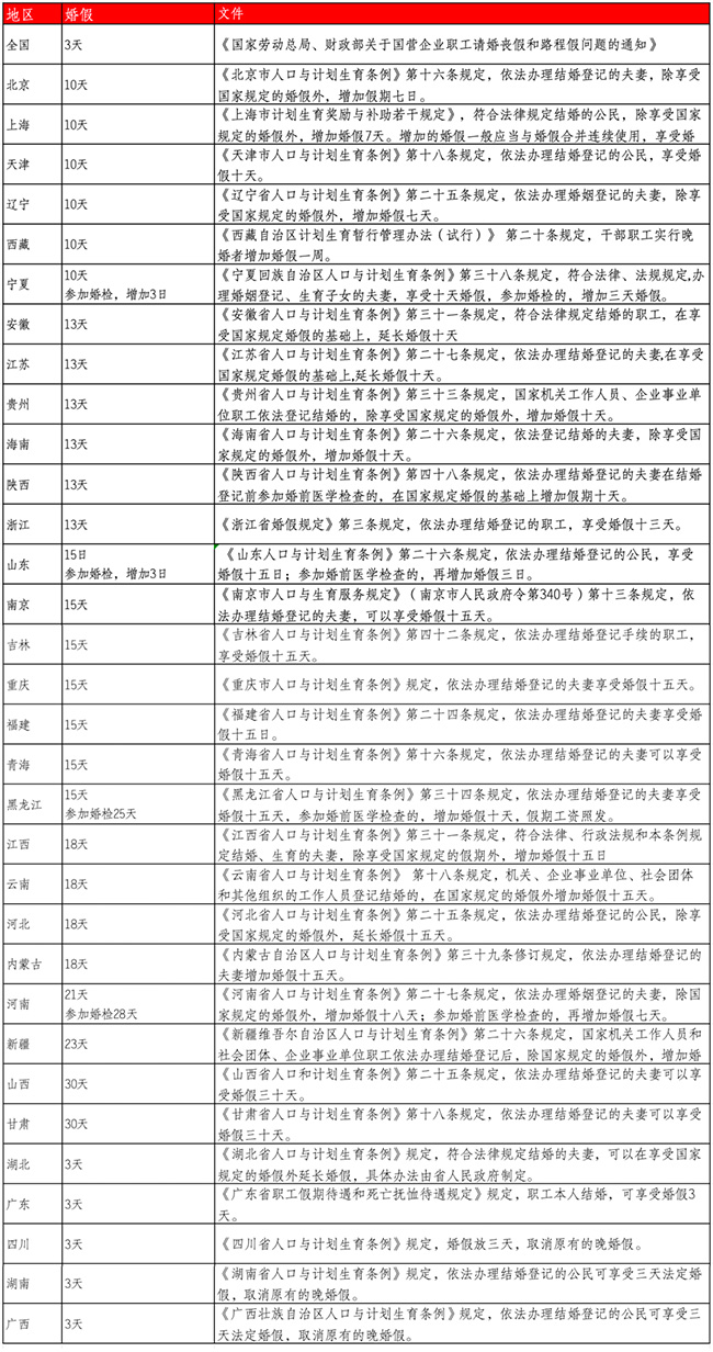 注:湖北省人民政府辦公廳發(fā)布了《關(guān)于加快完善生育支持政策體系更加務(wù)實有效建設(shè)生育友好型社會的若干措施》的通知,其中明確湖北省延長婚假至15天。 四川省人民政府辦公廳關(guān)于印發(fā)《四川省人民政府2025年立法計劃》的通知要求,擬于年內(nèi)出臺婚、產(chǎn)假延長相關(guān)政策。 二、二婚婚假規(guī)定 再婚者與初婚者一樣,均應(yīng)享受婚假待遇。 根據(jù)我國的相關(guān)規(guī)定,職工享受3天的婚假。對于再婚者的婚假問題,勞動和社會保障部門曾有明確答復(fù),即“根據(jù)《中華人民共和國婚姻法》和國家有關(guān)職工婚假的規(guī)定精神,再婚者與初婚者的法律地位相同,用人單位對再婚職工應(yīng)當參照國家有關(guān)規(guī)定,給予同初婚職工一樣的婚假待遇”。 三、婚假工資計算方法 不少企業(yè)對婚假的時間和婚假的工資支付有自己的“規(guī)定”,因此不少網(wǎng)友詢問婚假工資如何計算。 根據(jù)法律規(guī)定,用人單位可以制定本單位的規(guī)章制度,但是各個單位的規(guī)章制度必須符合國家或地區(qū)的法律法規(guī)和規(guī)章。 如果違反現(xiàn)有的法律法規(guī)和規(guī)章,這個規(guī)章制度就是違法的無效的,對職工并沒有約束作用。 如果單位硬要按“公司規(guī)定”辦事,由此侵犯了職工的合法權(quán)益,可能會有被被投訴的風(fēng)險。 根據(jù)《關(guān)于國營企業(yè)職工請婚喪假和路程假問題的通知》規(guī)定,假期在三個工作日以內(nèi)的,工資照發(fā)。