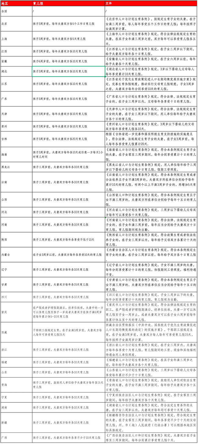 在日常實務(wù)中,大家會遇到一個最為常見的問題:員工請育兒假,可以不批嗎? 其實這個也需要分地區(qū)來看: 1、強制執(zhí)行育兒假的地區(qū) 如北京、天津、上海在《人口與計劃生育條例》中都明確規(guī)定,育兒假為強制休假。就全國范圍內(nèi)而言,育兒假都是強制推行的。 2、鼓勵但不強制推行育兒假的地區(qū) 但是也有少部分地區(qū)是鼓勵用人單位推行育兒假的,沒有做強制要求,如重慶市、吉林省等地。 建議查詢當?shù)毓俜叫畔ⅲY(jié)合當?shù)卣邅砜词欠衽鷾蕟T工請育兒假的申請。 二、育兒假工資計算標準 關(guān)于休育兒假的待遇標準,有三種: 1、地方有規(guī)定的,優(yōu)先適用地方規(guī)定的標準。 舉個例子,《上海市人口與計劃生育條例》第三十一條規(guī)定:“符合法律法規(guī)規(guī)定生育的夫妻,在其子女年滿三周歲之前,雙方每年可以享受育兒假各五天。育兒假期間的工資,按照本人正常出勤應(yīng)得的工資發(fā)給。”按照這一規(guī)定,上海市職工休育兒假的,用人單位應(yīng)當按正常出勤標準發(fā)放工資。 2、按勞動合同或規(guī)章制度規(guī)定的標準來確定。 如果地方法規(guī)未對育兒假期間的待遇標準作出規(guī)定,用人單位可以通過勞動合同約定或者規(guī)章制度規(guī)定的方式,明確育兒假期間的工資待遇標準。但一般情況下,勞動合同約定或者規(guī)章制度規(guī)定的標準不得低于當?shù)刈畹凸べY標準。 3、按視同出勤標準支付育兒假工資。 地方規(guī)定不明確,用人單位也未通過勞動合同或規(guī)章制度規(guī)定育兒假工資的,用人單位應(yīng)當按照正常出勤支付員工工資待遇。