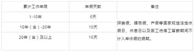 年假工資計算方法 一、關(guān)于年假的相關(guān)規(guī)定 根據(jù)《職工帶薪年休假條例》國務(wù)院令第514號,第二條,職工連續(xù)工作1年以上的,享受帶薪年休假。 其中的連續(xù)工作1年,后續(xù)出臺的條例中有一些調(diào)整,根據(jù)《企業(yè)職工帶薪年休假條例》第四條,年休假天數(shù)根據(jù)職工累計工作時間確定。職工在同一或者不同用人單位工作期間,以及依照法律、行政法規(guī)或者國務(wù)院規(guī)定視同工作期間,應(yīng)當計為累計工作時間。 所以年假的條件應(yīng)按照累計工作時間計算,只要累計工作時間1年及以上,就符合年休假規(guī)定。 具體年假天數(shù)的規(guī)定可查看下表: