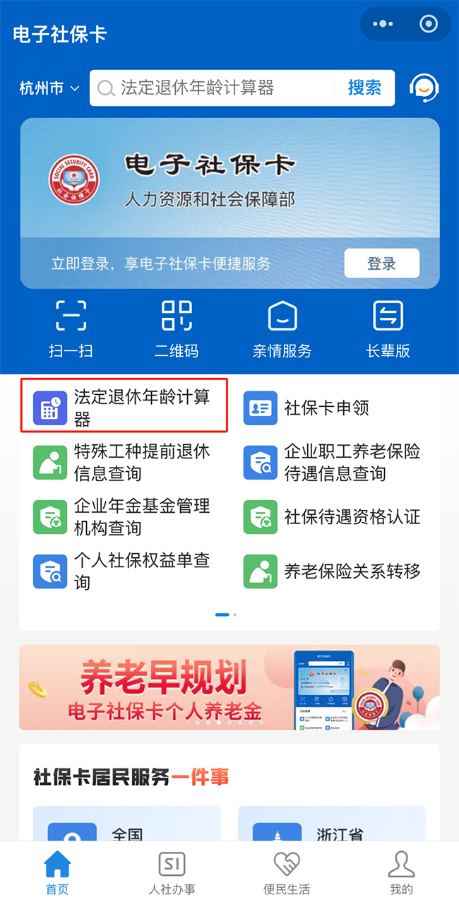 2、本人對(duì)應(yīng)的法定退休年齡查詢 參保人員查詢本人法定退休年齡,可以通過4個(gè)人力資源和社會(huì)保障部的官方線上服務(wù)渠道查詢: (1)國(guó)家社會(huì)保險(xiǎn)公共服務(wù)平臺(tái); (2)全國(guó)人社政務(wù)服務(wù)平臺(tái); (3)電子社保卡; (4)“掌上12333”APP。 通過上述途徑訪問“退休年齡計(jì)算器”,輸入本人的出生日期、性別等信息,即可查詢對(duì)應(yīng)的法定退休年齡和退休年月。
