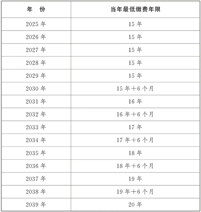 此外,參保人員還可以通過撥打12333咨詢服務(wù)熱線、前往社會(huì)保險(xiǎn)經(jīng)辦機(jī)構(gòu)服務(wù)窗口等線下方式,查詢本人法定退休年齡。 3、關(guān)于最低繳費(fèi)年限 2029年12月31日前,職工按月領(lǐng)取基本養(yǎng)老金最低繳費(fèi)年限仍為15年。 從2030年1月1日起,按照每年提高6個(gè)月的節(jié)奏,將職工按月領(lǐng)取基本養(yǎng)老金最低繳費(fèi)年限由15年逐步提高至20年。 提高最低繳費(fèi)年限情況表: